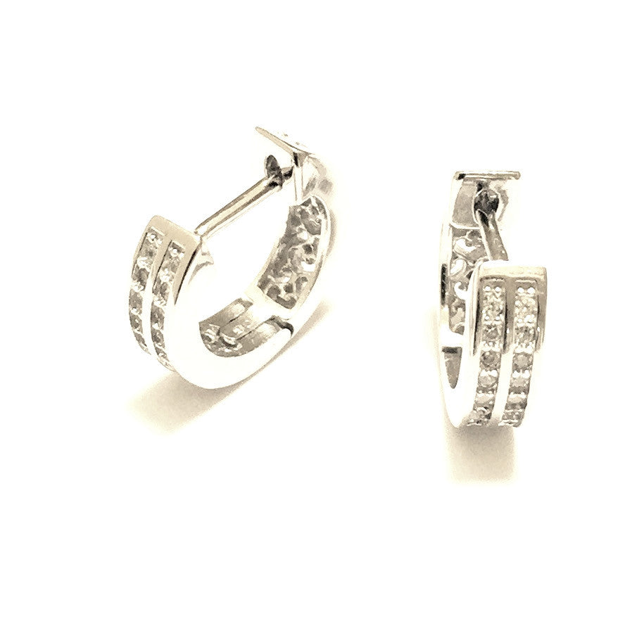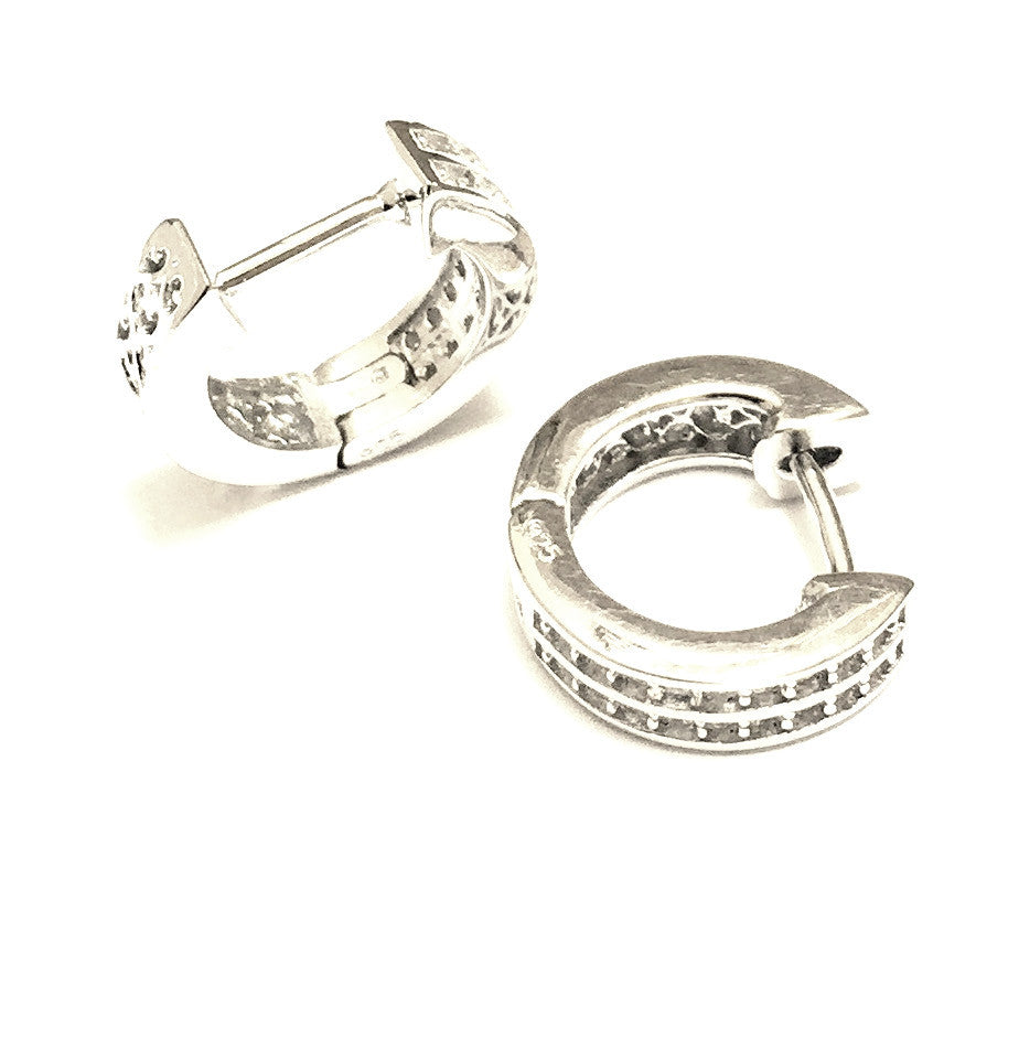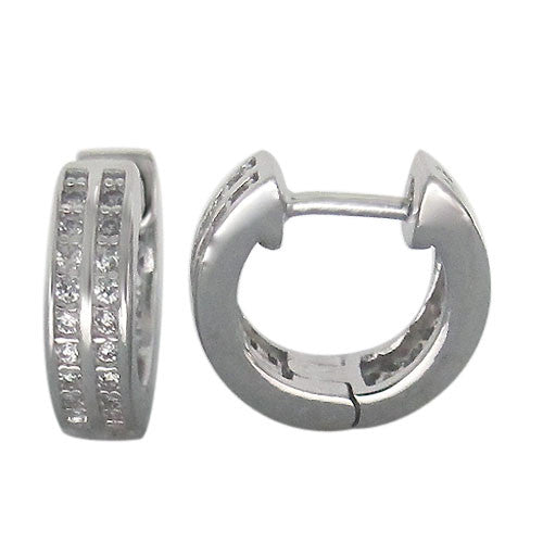 Rhodium plated on Sterling Silver, round shape huggie hoop with faceted stone and clip closure.